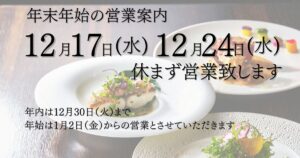 レストランルカは年内12/30(月)まで休まず営業いたします。